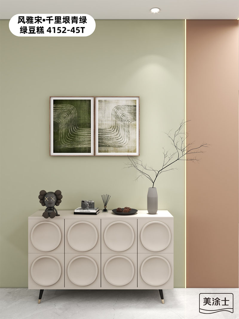 自带森系气质的茶绿色墙面,从客厅沙发背景墙延伸到过道以及餐厅背景墙处。这一抹绿豆糕4152-45T,不仅能体现您独特的个性,更使整个家中都增添一股清爽强劲的盎然之意。