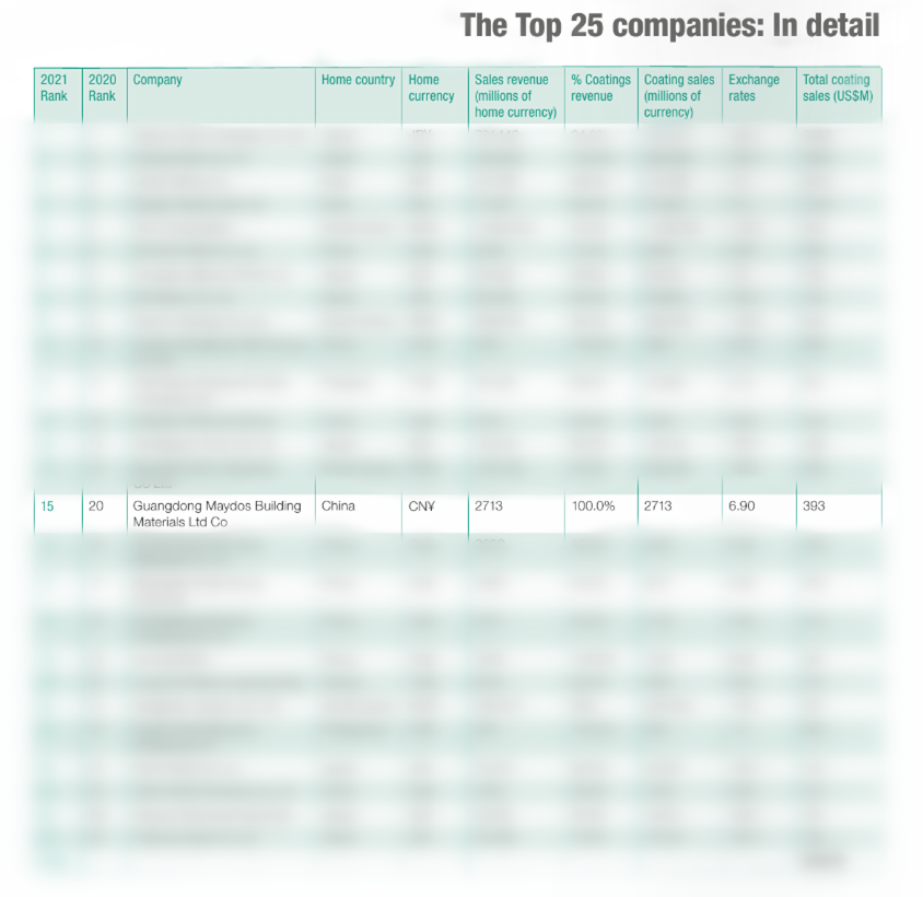 近日,《亚太涂料杂志》发布2021年亚太涂料制造商25强排行榜。该榜单是根据2020年涂料产品收入计算的,反映了2020年亚洲涂料市场情况。榜单显示,排名前25位的涂料公司2020年累计销售额为239.5亿美元,同比增长2%“,合乐HL8集团排名第15位!